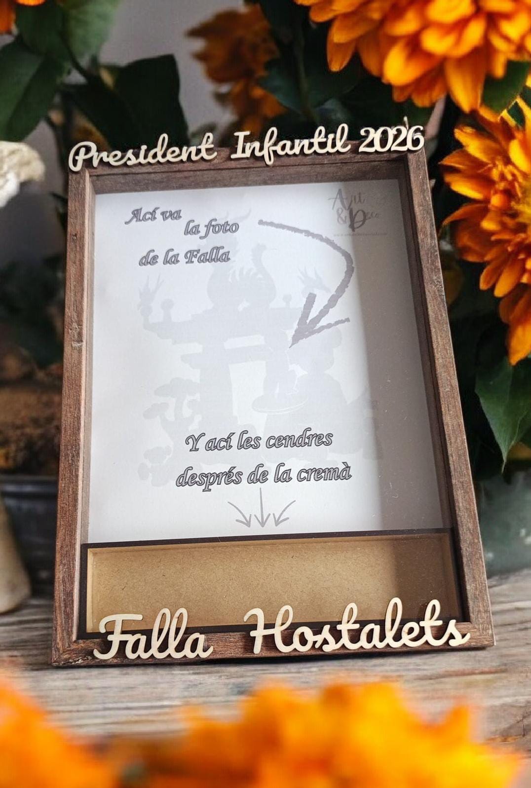 Marco de madera, formato A4 (29cm x 20cm), con la foto de tu falla y acople para guardar las cenizas.